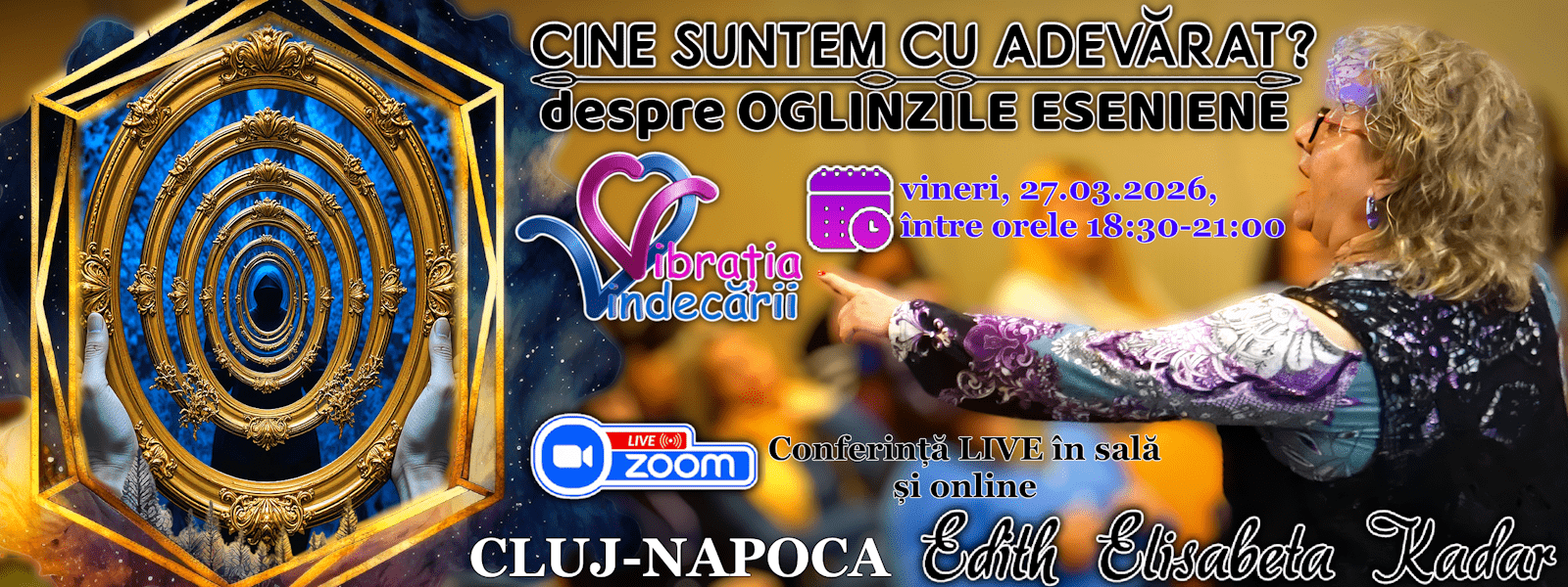 Te invit să îmi fii alături în seara de vineri, 27 martie, de la ora 18.30 la o conferință pe tema „CINE SUNTEM CU ADEVĂRAT?” - despre OGLINZILE ESENIENE, cele care ne ajută la creșterea noastră, dezvoltarea în spirit și descoperirea în esență.